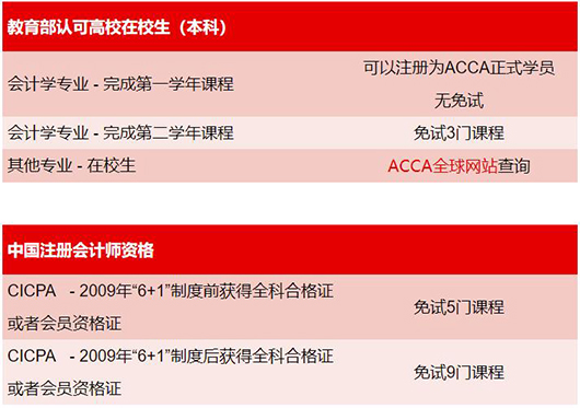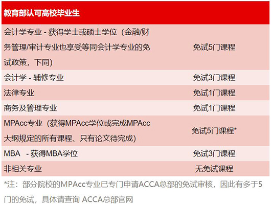 部分财务相关专业大学在校或毕业学生,参加ACCA考试注册时,将获得一定科目的免试权。ACCA对于参加专业会计师考试(ACCA)的中国学员的免试政策详情如下: